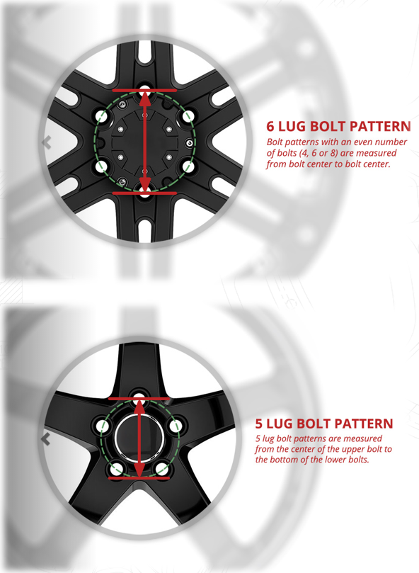 Wheel fitment requires the bolt (or lug) pattern of the wheel to match the vehicle. The bolt pattern is the number of lugs and the diameter of the circle they create.