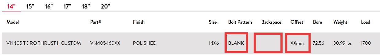 If the chart seems incomplete or is missing information, there's a great chance the wheel is custom-built and made-to-order. Customers will provide the desired specs at the time of the order.