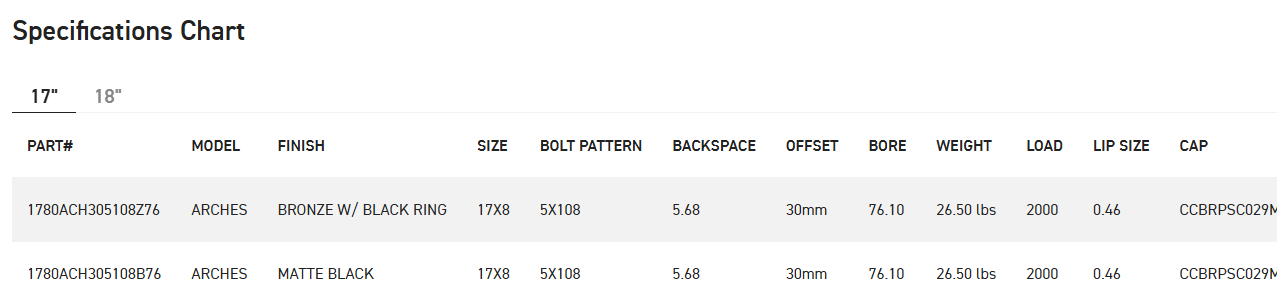 The Specifications Chart is located at the bottom of each wheel's product page. The specifications may differ by part number.