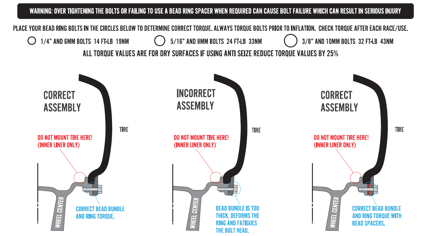 WARNING: OVER TIGHTENING THE BOLTS OR FAILING TO USE A BEAD RING SPACER WHEN REQUIRED CAN CAUSE BOLT FAILURE WHICH CAN RESULT IN SERIOUS INJURY.